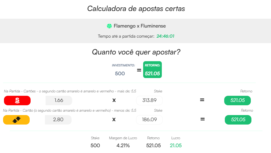 - Stake para Resultado X = (Investimento Total × Probabilidade do Resultado X) ÷ Soma das Probabilidades